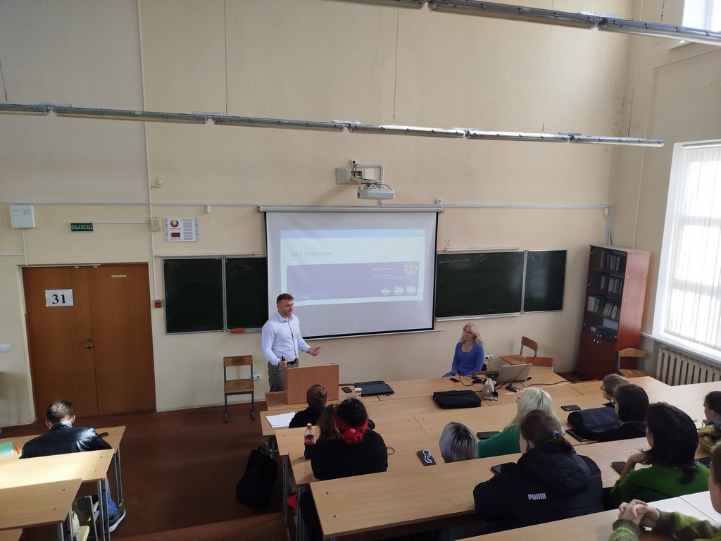 Дмитрий Шевчук в понятной и доступной форме рассказал студентам о разработке программного обеспечения на платформе .Net, необходимом стеке технологий для успешной работы в качестве .Net разработчика и др.