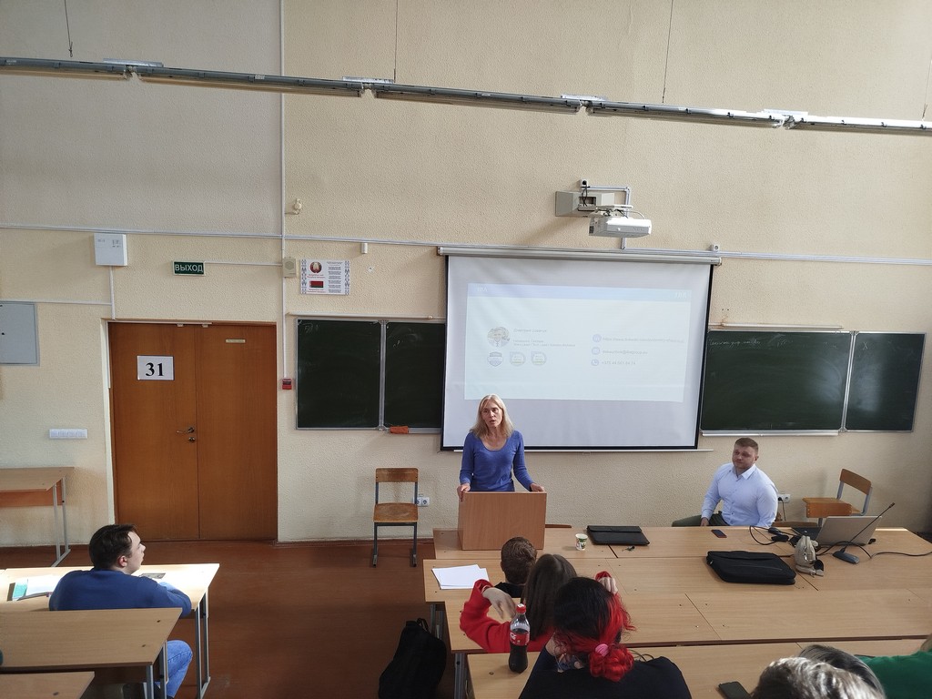 Елена Ведмедь рассказала студентам о работе в компании «ИВА-Гомель-Парк», об основных направлениях деятельности компании, о возможностях стажировки и трудоустройства студентов IT-специальностей в компании.