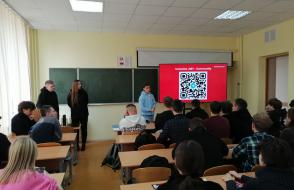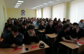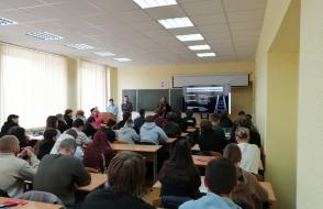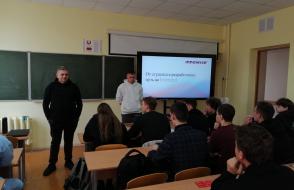 Юлия Терешкова (рекрутер отдела по работе с талантами), Дмитрий Житников (руководитель регионального отдела Frontend разработки), Александр Бородин (.NET Developer), Виталий Ковальчук (руководитель регионального офиса) рассказали студентам об основных направлениях деятельности компании, о возможностях прохождения стажировок, практик и трудоустройства в компанию.
