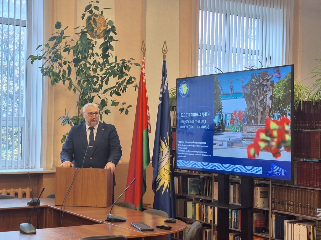 На пленарным пасяджэнні выступіл дэкан факультэта гісторыі і міжкультурных камунікацый, кандыдат гістарычных навук, дацэнт С. А. Чаропка, які закрануў пытанні генацыда беларускага народа на матэрыялах Гомеля, у прэзентацыі ён прадэманстраваў фотадакументы, якія сведчаць аб адкрыцці новых фактаў з трагічных старонак ваеннага мінулага. Доктар гістарычных навук, прафесар, прафесар кафедры сацыяльна-гуманітарных і прававых дысцыплін УА “Гомельскі дзяржаўны тэхнічны ўніверсітэт імя П. В. Сухога” С. А. Елізараў распавядаў пра беларускі праект Заходняй вобласці 1921 года. У сваім выступленні А. Р. Яшчанка ахарактарызавала прадметнае насычэнне музейнай экспазіцыі, прысвечанай гісторыі ГДУ імя Ф. Скарыны, падыходы да яе абнаўлення ў 2025 годзе да 95-гадовага юбілея ўніверсітэта і пазначыла перспектывы развіцця музейнай справы, накіраванай на захаванне памяці аб нашай навучальнай установе. Паведамленне суправаджалася дэманстрацыяй старых фотаздымкаў і вызначэннем ролі выкладчыкаў і студэнтаў ва ўдасканаленні адлюстравання гісторыі  універсітэта.