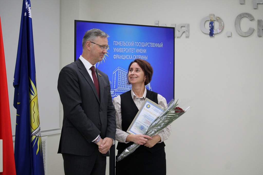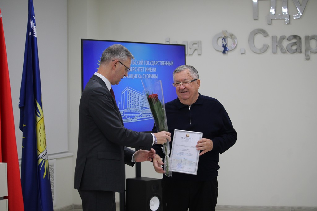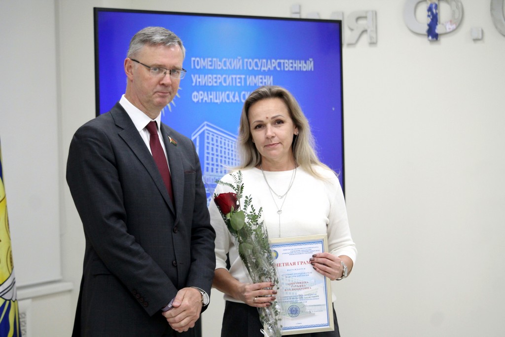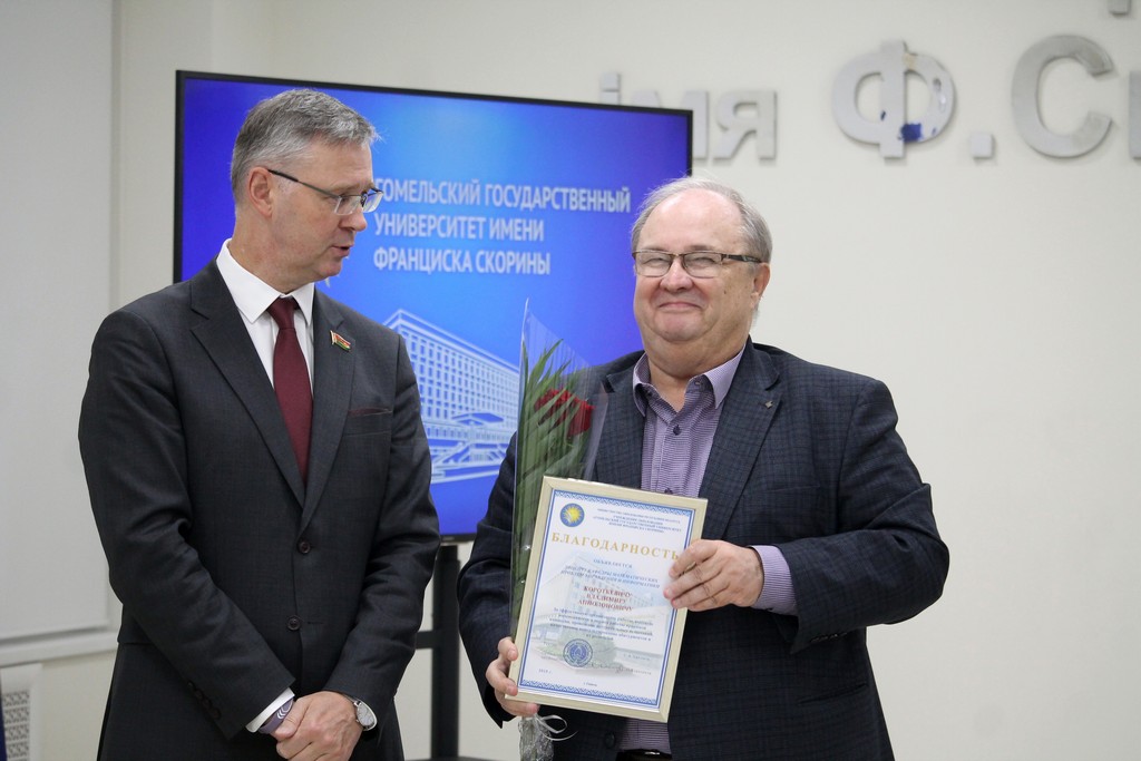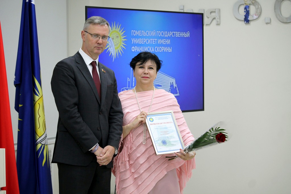 Заседание началось на торжественной ноте: сотрудники ГГУ получили заслуженные награды из рук ректора вуза Сергея Хахомова. Благодарности Премьер-министра Республики Беларусь «за шматгадовую пленную навукова-педагагiчную дзейнасць, дасягнутыя поспехi ў падрыхтоўцы высокаквалiфiкаваных спецыялiстаў» удостоен профессор кафедры алгебры и геометрии Виктор Монахов. В связи с присвоением ученого звания доцента по специальности «Электроника и наноэлектроника» аттестат доцента вручен доценту кафедры общей физики Сергею Соколову. Почетной грамотой университета за многолетнюю плодотворную учебную и воспитательную работу по подготовке квалифицированных специалистов награждены старший преподаватель кафедры биологии Татьяна Азявчикова, кандидат химических наук, доцент кафедры химии Елена Воробьева, кандидат физико-математических наук, доцент, заведующий кафедрой оптики Владимир Гайшун, кандидат экономических наук, доцент кафедры экономической информатики, учета и коммерции Сергей Говейко, кандидат филологических наук, доцент кафедры белорусского языка Екатерина Хазанова.