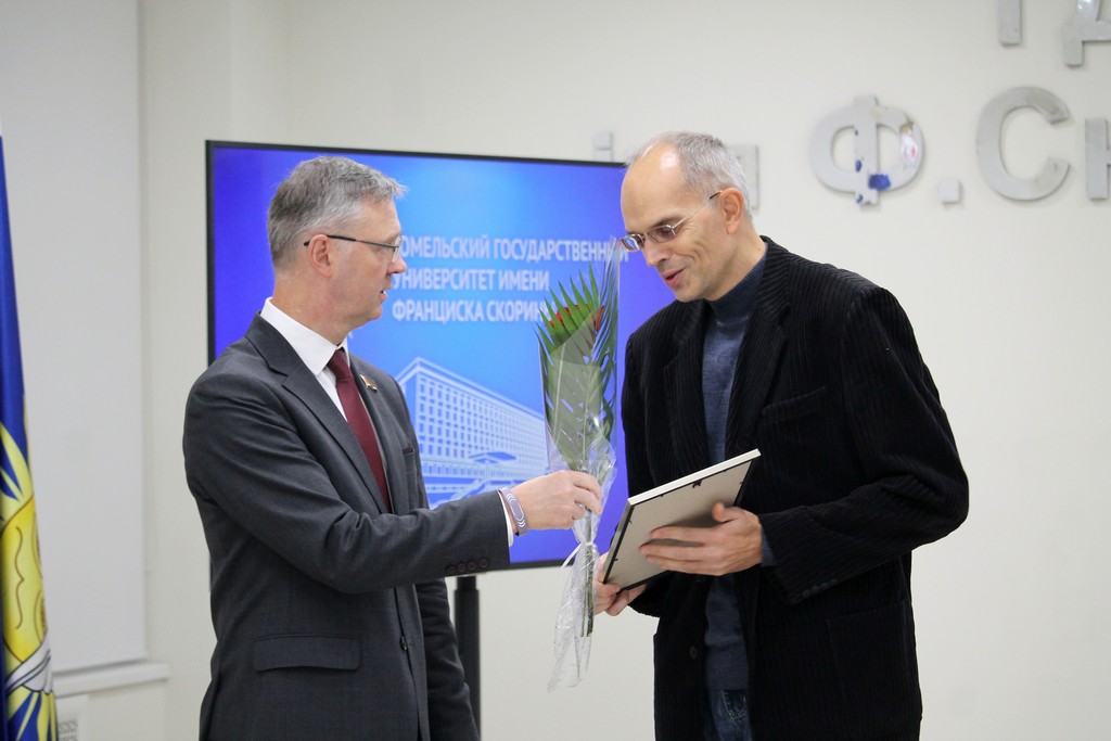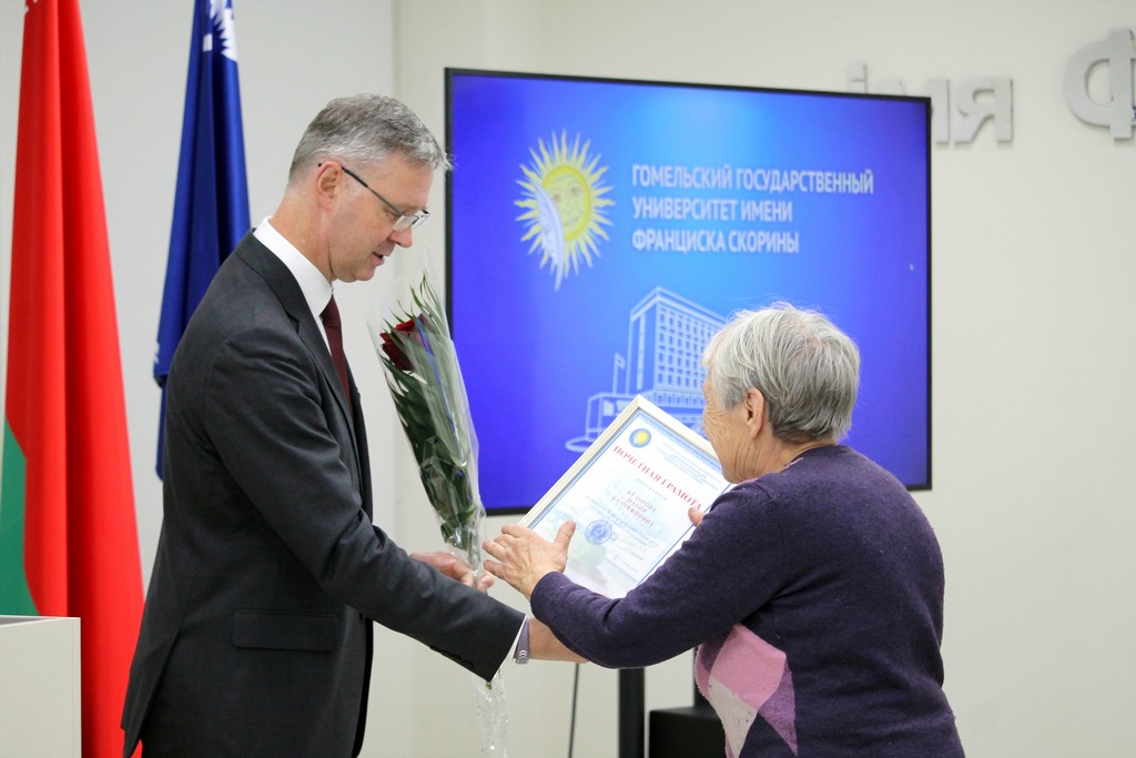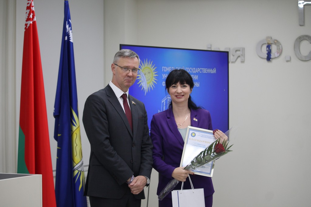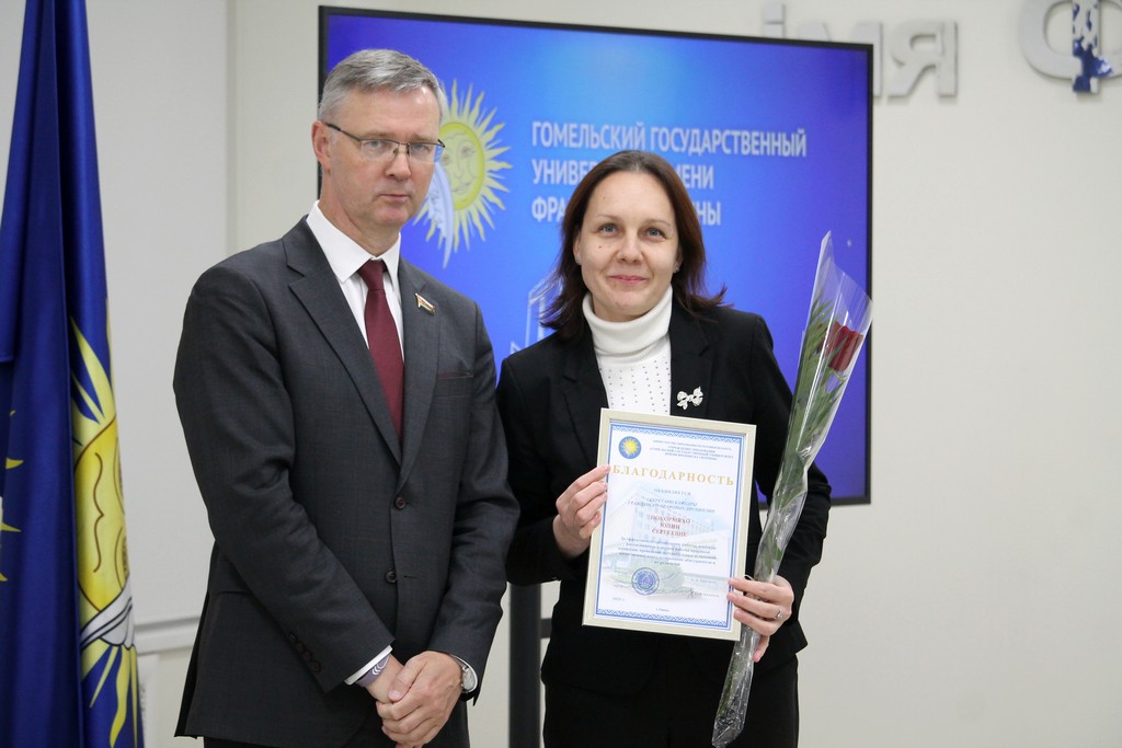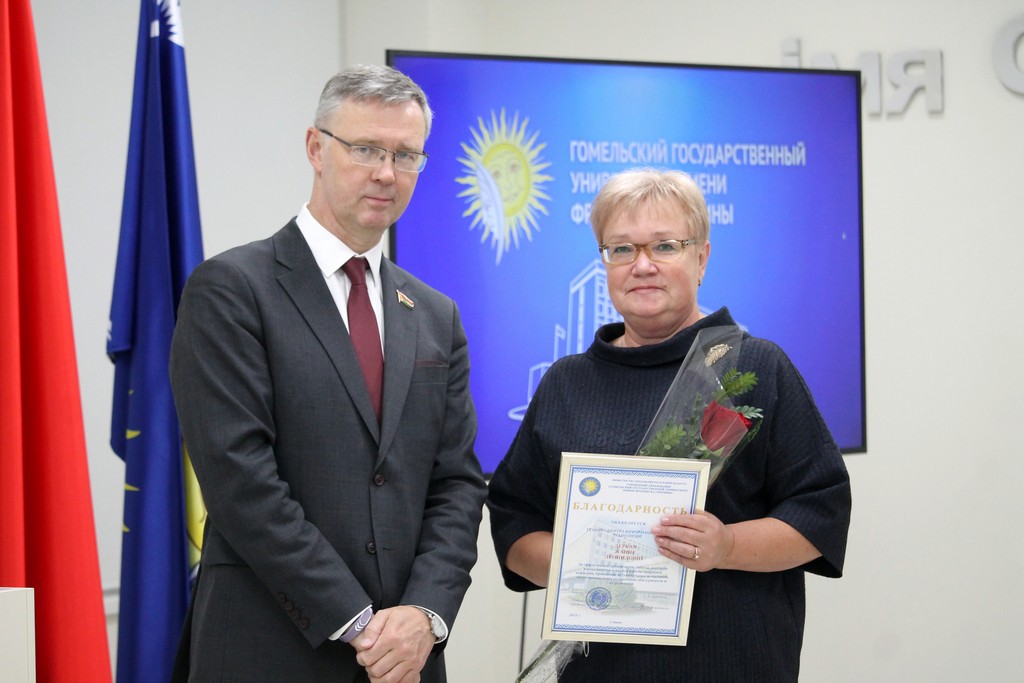 Заседание началось на торжественной ноте: сотрудники ГГУ получили заслуженные награды из рук ректора вуза Сергея Хахомова. Благодарности Премьер-министра Республики Беларусь «за шматгадовую пленную навукова-педагагiчную дзейнасць, дасягнутыя поспехi ў падрыхтоўцы высокаквалiфiкаваных спецыялiстаў» удостоен профессор кафедры алгебры и геометрии Виктор Монахов. В связи с присвоением ученого звания доцента по специальности «Электроника и наноэлектроника» аттестат доцента вручен доценту кафедры общей физики Сергею Соколову. Почетной грамотой университета за многолетнюю плодотворную учебную и воспитательную работу по подготовке квалифицированных специалистов награждены старший преподаватель кафедры биологии Татьяна Азявчикова, кандидат химических наук, доцент кафедры химии Елена Воробьева, кандидат физико-математических наук, доцент, заведующий кафедрой оптики Владимир Гайшун, кандидат экономических наук, доцент кафедры экономической информатики, учета и коммерции Сергей Говейко, кандидат филологических наук, доцент кафедры белорусского языка Екатерина Хазанова.
