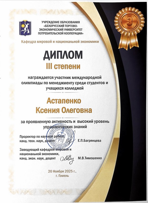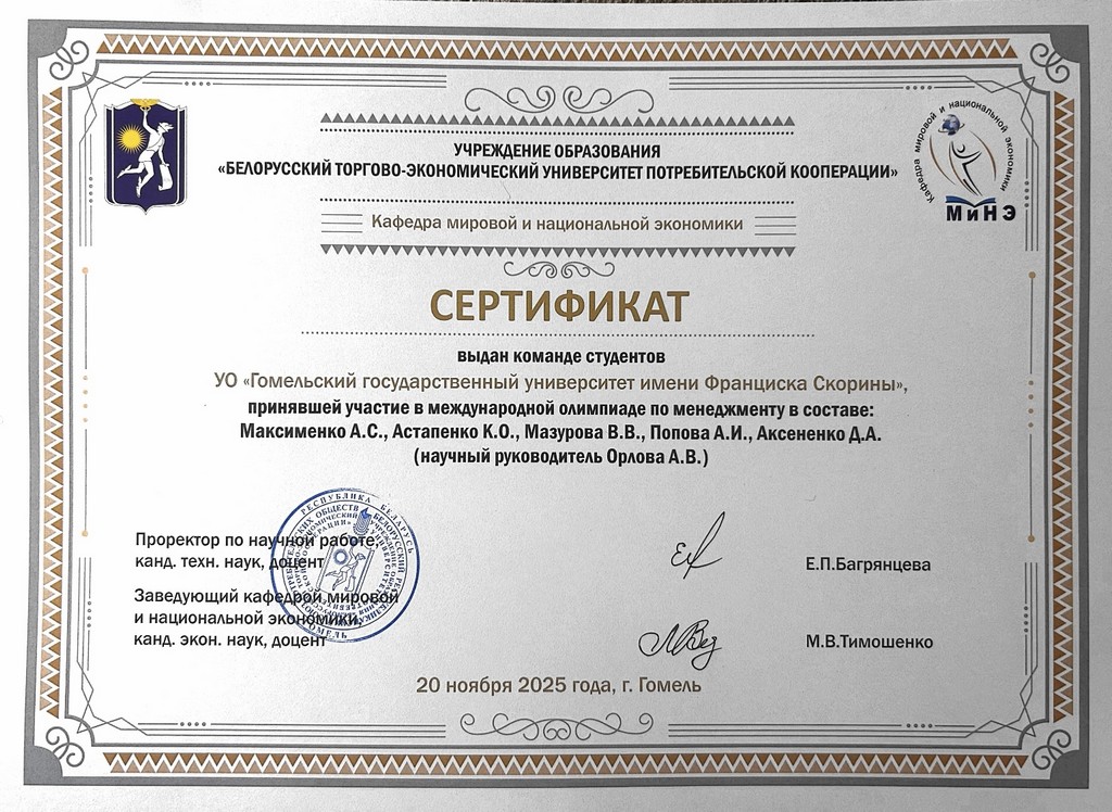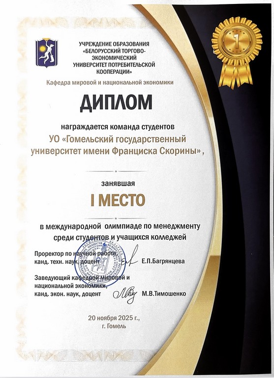 20 ноября на базе кафедры мировой и национальной экономики учреждения образования «Белорусский торгово-экономический университет потребительской кооперации» состоялась международная олимпиада среди студентов по дисциплине «Менеджмент». В олимпиаде приняли участие студенты, представившие вузы Республики Беларусь, Российской Федерации, Республики Таджикистан.