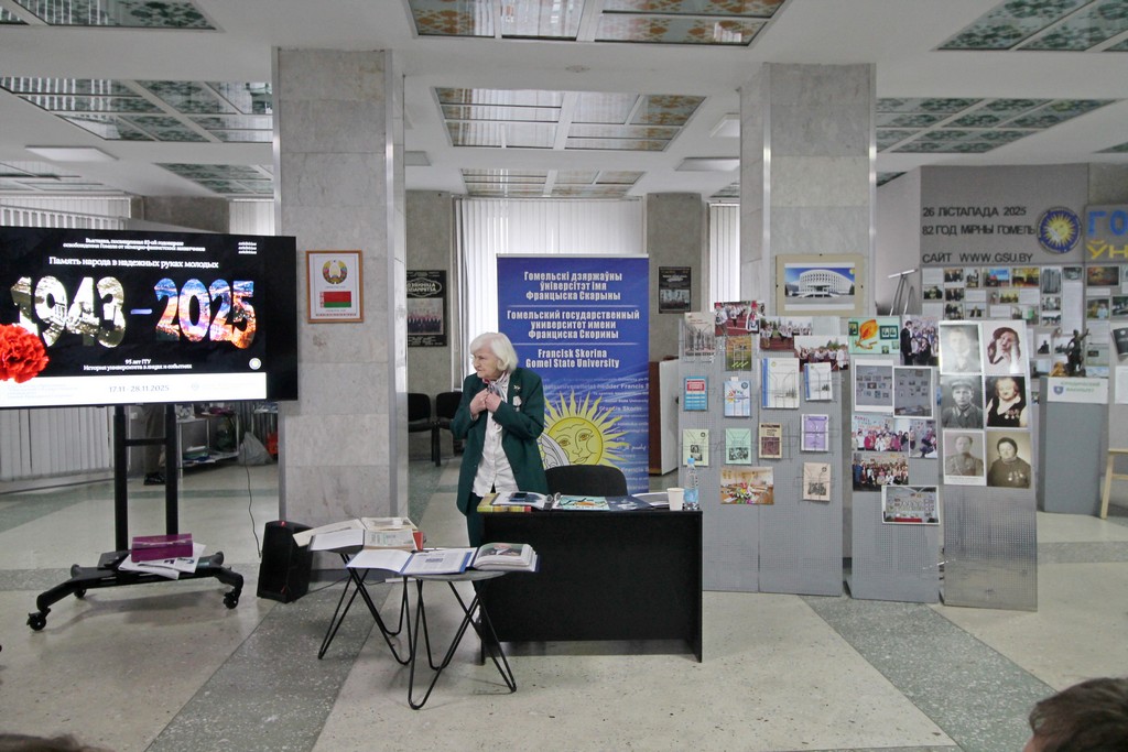 На выставке были представлены документы государственных архивов; портфолио участника войны, кандидата исторических наук, доцента ГГУ Георгия Саввича Евдокименко и освободителя Гомеля Ивана Максимовича Платонова; портфолио «Давным-давно была война... Но помним мы…» с публикациями, в которых освещены мероприятия гражданско‑патриотической направленности в нашем университете. Выставочный проект включал также архивные материалы волонтерского общества «Друг детей» и волонтерского отряда «Память» за многие годы; фотографии и материалы из волонтерских проектов о войне; книги, в которых отражена деятельность по патриотическому воспитанию молодежи; работа Нины Ивановны Морозовой в госпитале.