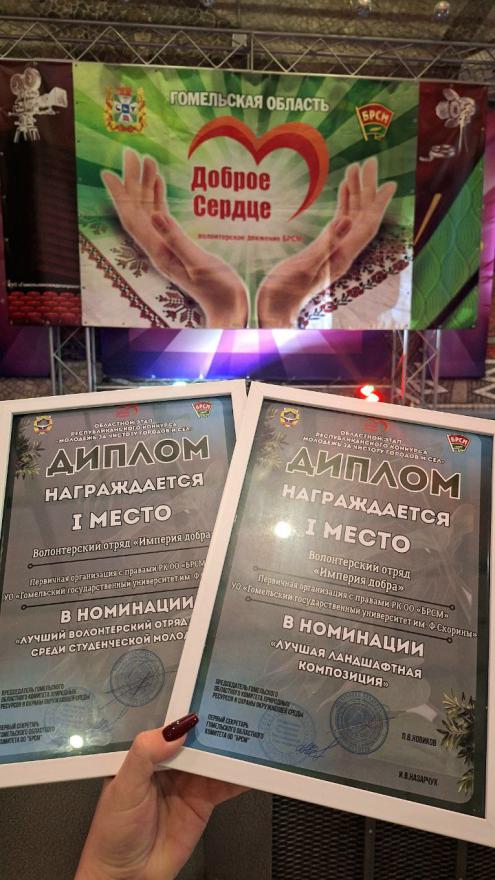 Представители ГГУ имени Ф. Скорины стали обладателями диплома 1 степени в 2-х номинациях: «Лучший волонтерский отряд среди студенческой молодежи», «Лучшая ландшафтная композиция».
