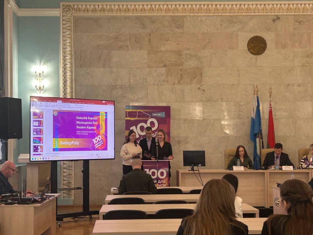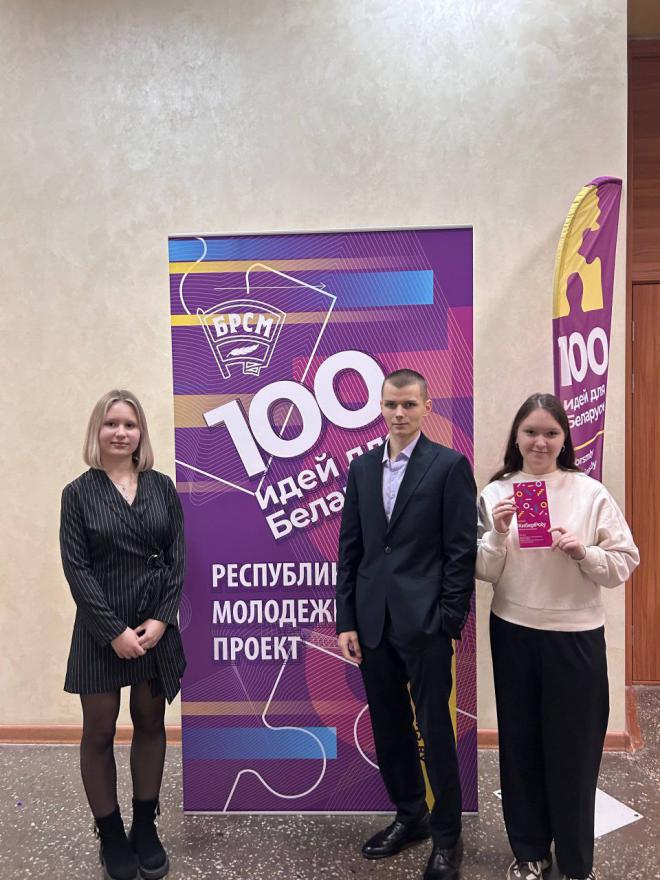 19 сентября на базе Белорусского государственного университета транспорта состоялся областной этап республиканского конкурса «100 идей для Беларуси». Студенты нашего университета представили на суд экспертов 5 проектов: три от факультета физики и ИТ («КиберPoly» (Кирилл Ковалёв, Яна Мелещенко, Карина Янович), «GSUSystem» (Даниил Лапчук, Михаил Шелудяков, Иван Силивончик), «Уголок белорусско-туркменской дружбы» (Аман Мередов)) и 2 от факультета психологии и педагогики («Тепло БелАЭС (Бывшее Атомное тепло: Энергия для города)» (София Кочунова) и «Беларусь чувствами молодежи» (Даниил Приходько, Артем Фрайман)). Проекты «Беларусь чувствами молодежи», «Уголок белорусско-туркменской дружбы» будут презентованы на республиканском этапе конкурса. Поздравляем!