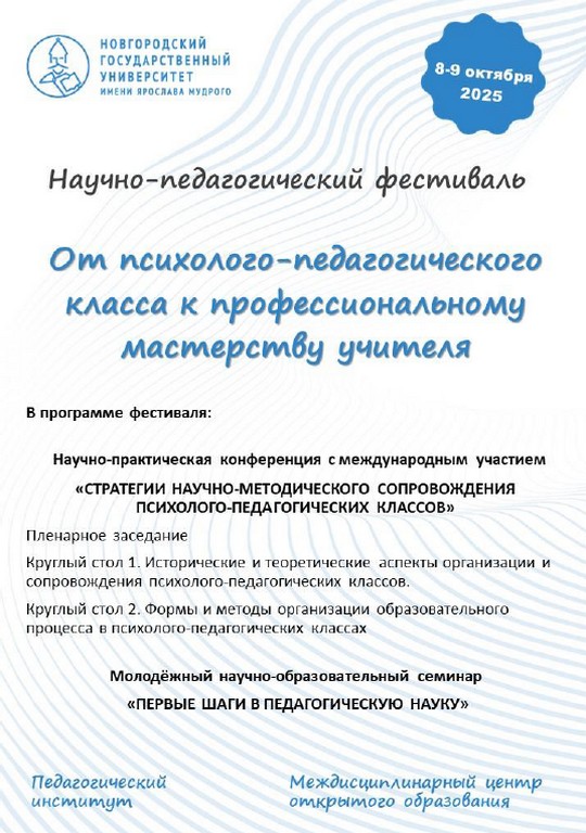 8-9 октября в Великом Новгороде на базе Междисциплинарного центра открытого образования при Педагогическом институте ФГБОУВО «Новгородский государственный университет имени Ярослава Мудрого» проходит научно-педагогический фестиваль «От психолого-педагогического класса к профессиональному мастерству учителя».