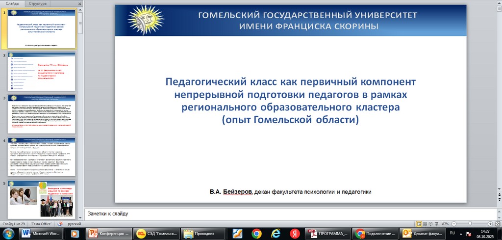 Декан факультета психологии и педагогики Владислав Бейзеров в своем докладе «Педагогический класс как первичный компонент непрерывной подготовки педагогов в рамках регионального образовательного кластера» поделился опытом нашего университета в организации работы с педагогическими классами в Гомельской области, проводимой на протяжении последних 10 лет.